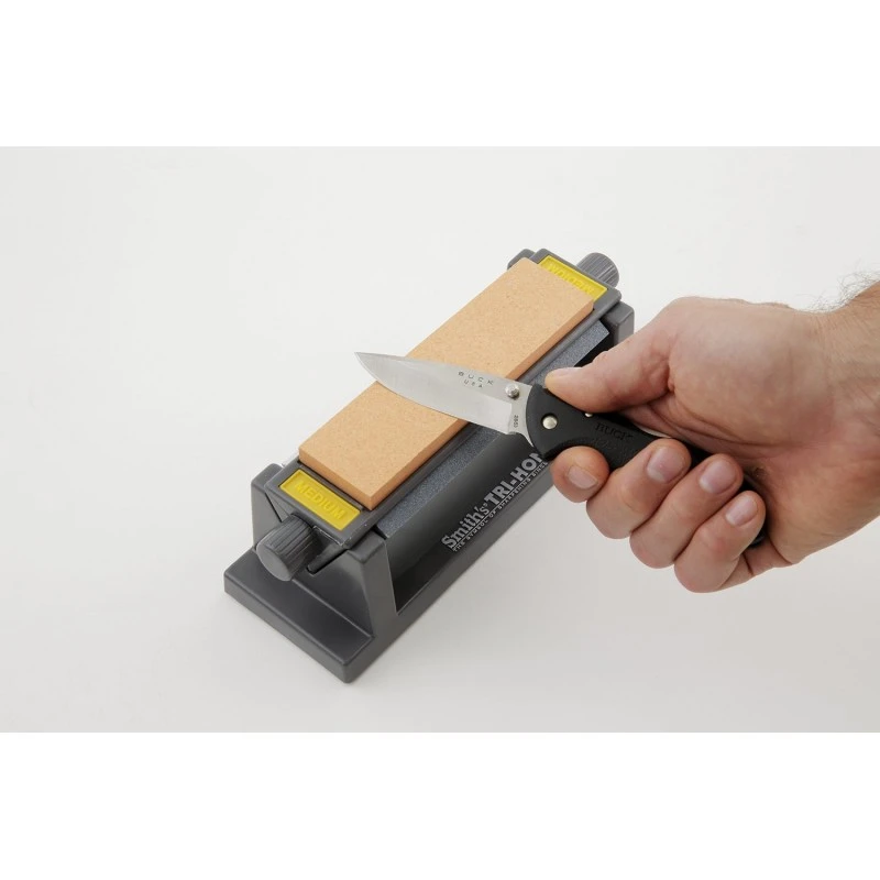 L’Affûteur 3 faces Smith’s est composé de 3 pierres différentes à aiguiser sur un socle à système de rotation pour une utilisation plus rapide et efficace.