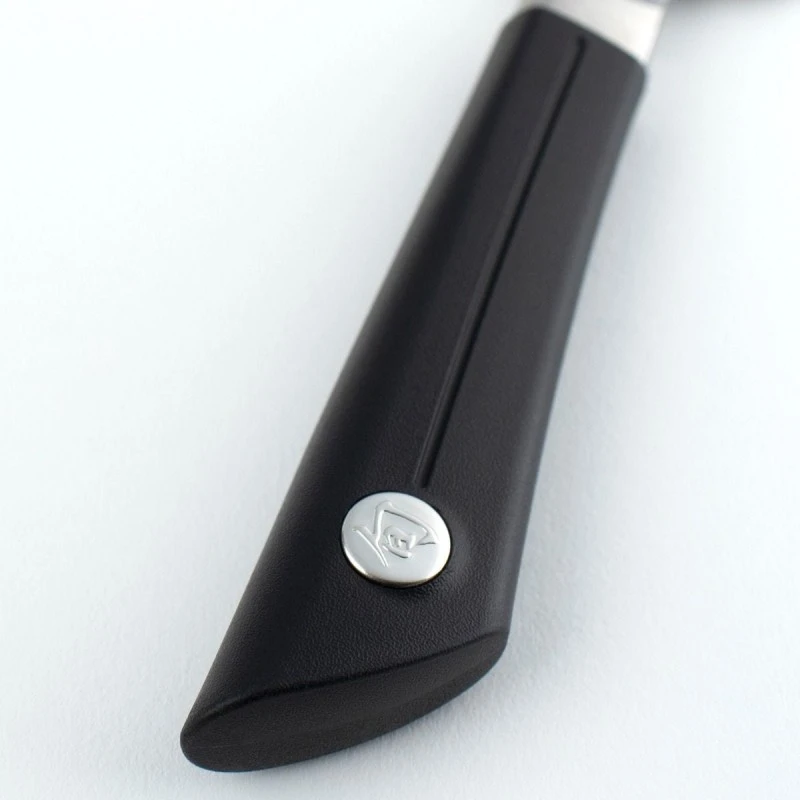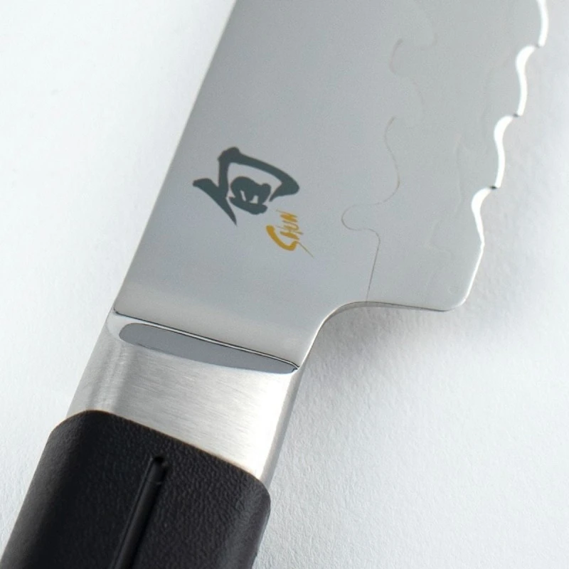 Ces dentelures plus larges glissent facilement dans le pain. La coupe est encore plus douce car Shun a conçu les dentelures de manière à ce que la puissance de coupe soit égale sur les coups avant et arrière. Regardez la lame et vous verrez que les dentelures sont inclinées vers l’avant sur l’avant de la lame et vers l’arrière sur l’arrière de la lame. Ce petit changement fait une grande différence dans la facilité de coupe.