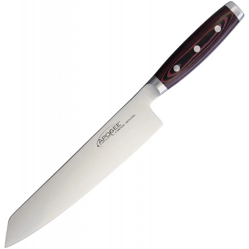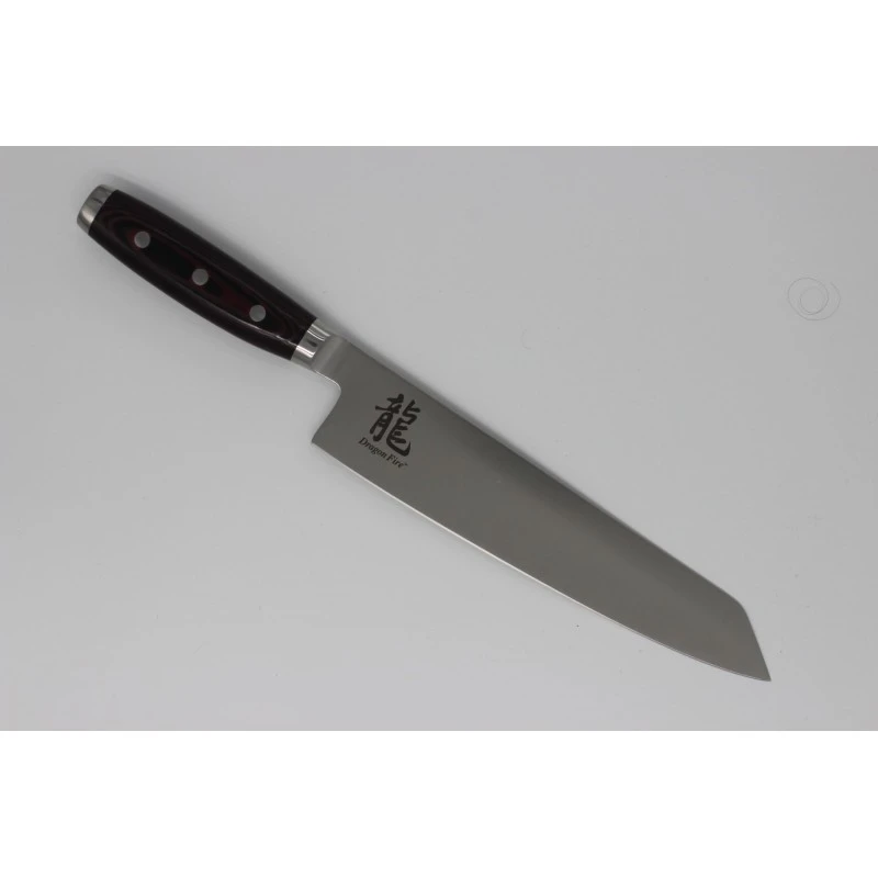 Le Couteau de cuisine Fire Kiritsuke Dragon by Apogée offre une lame lisse en acier inoxydable CTS-BD1 de 22.9cm et un manche en micarta rouge et noir.