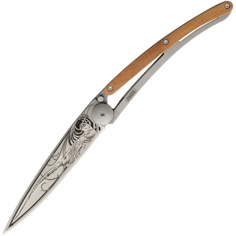Voici le Couteau Deejo Tattoo Faisan qui possède un manche en bois de genévrier.