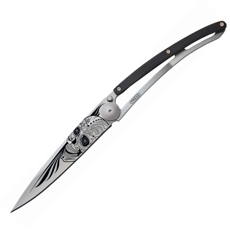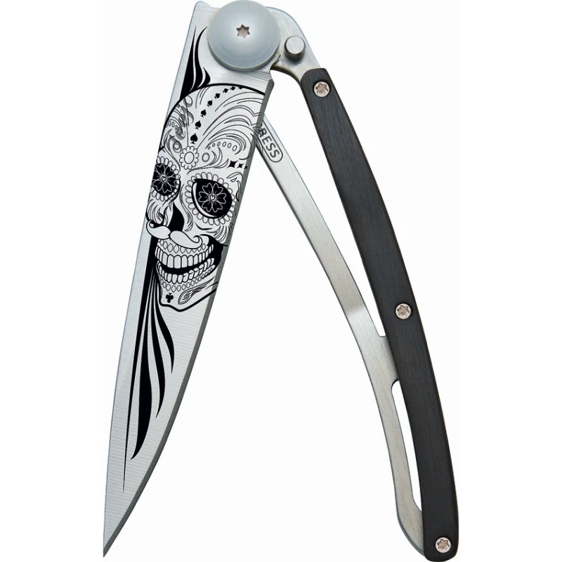 Voici le Couteau Deejo Tattoo Crâne Latino qui possède un manche en bois de grenadille.