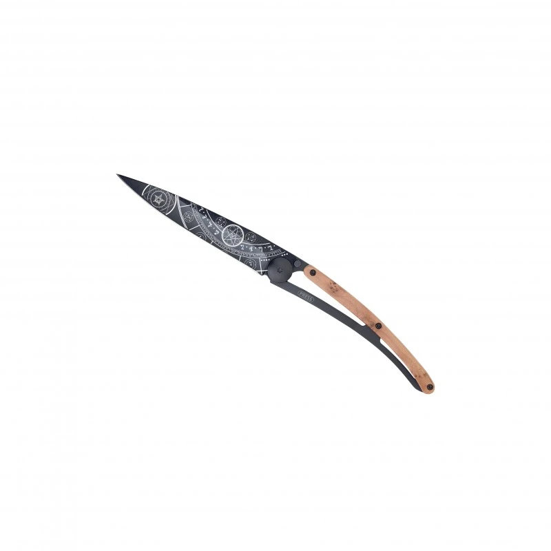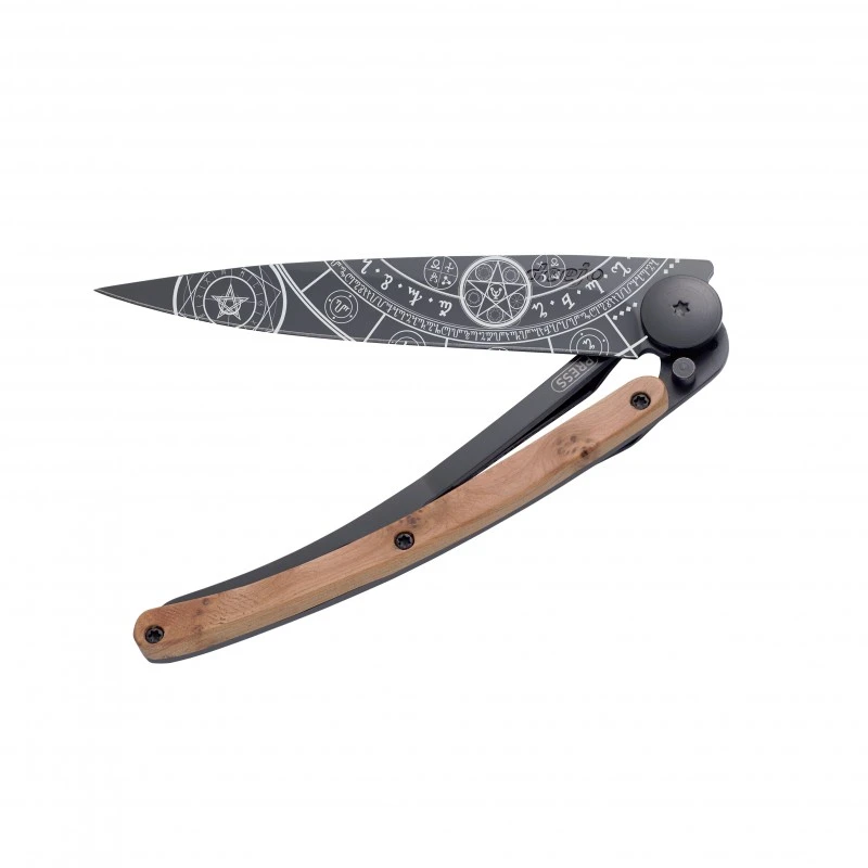 Voici le Couteau Deejo Tattoo Esotérique qui possède un manche en bois de genévrier.