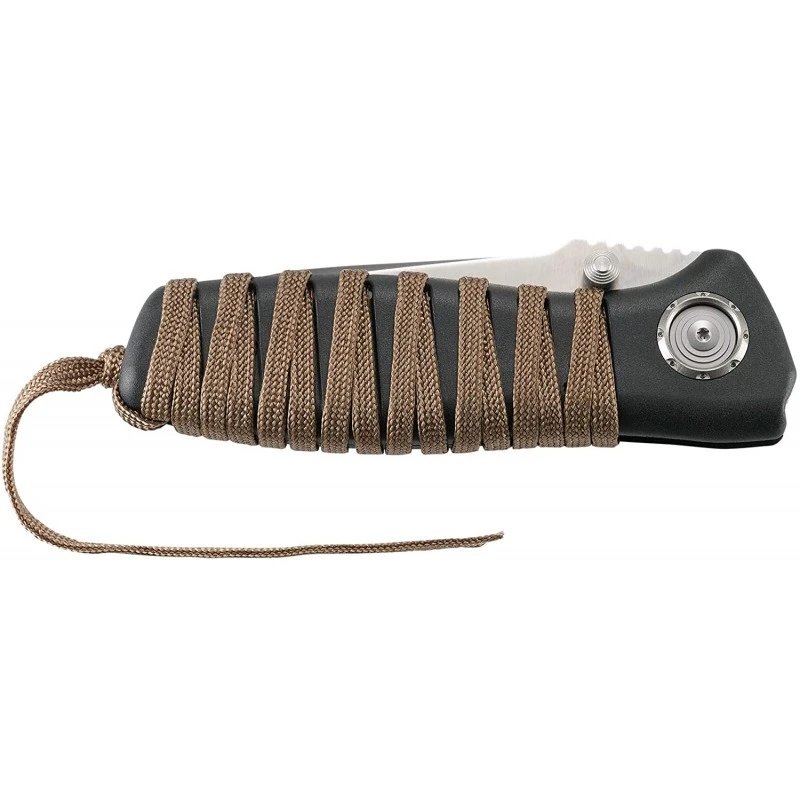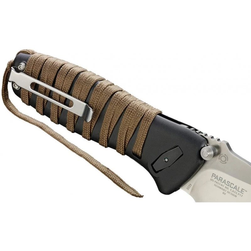 Le Couteau Parascale CRKT est conçu avec une lame en acier D2 ainsi qu’un manche en nylon renforcé de fibre de verre enroulé de corde.