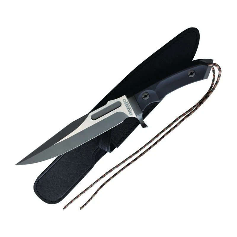 La poignée du couteau est sculptée en noir, offrant une prise en main confortable et assurée. L’étui en cuir de buffle noir fourni avec le couteau assure un transport sûr et élégant. De plus, une lanière en paracorde camouflage est incluse pour une utilité supplémentaire.