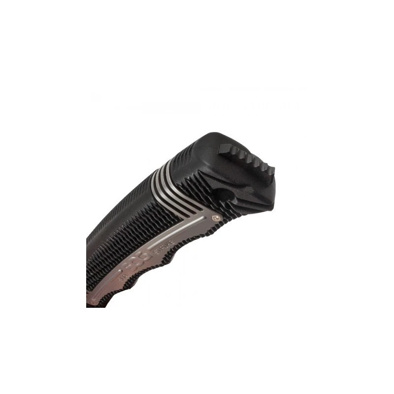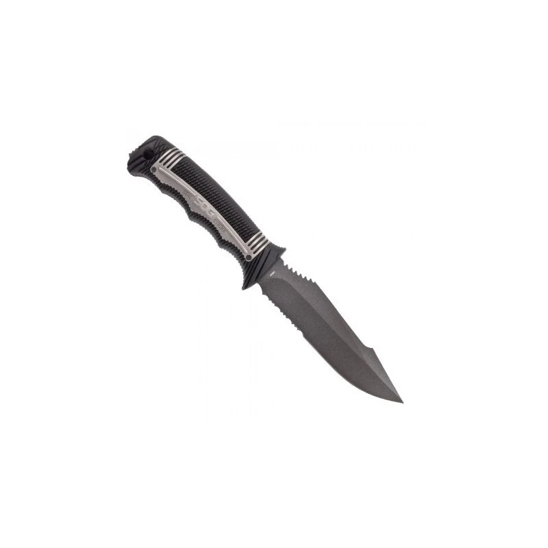 Sa lame en AUS-8 de 12.4cm Gris est semi-dentelée.