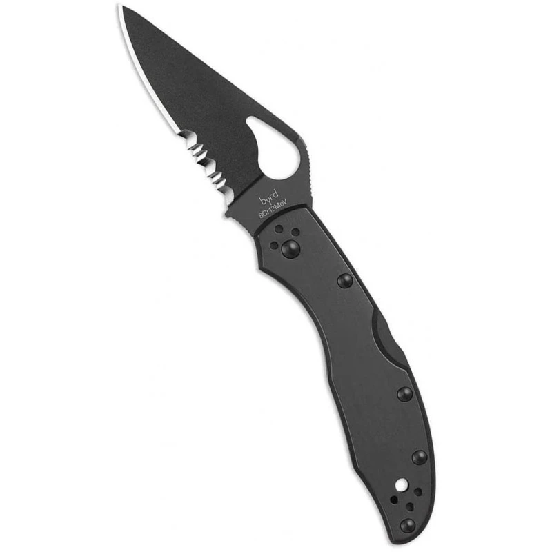 Sa lame pliable en acier 8Cr13MoV de 7.6cm est semi dentelée avec un système de verrouillage à Cran d’arrêt.