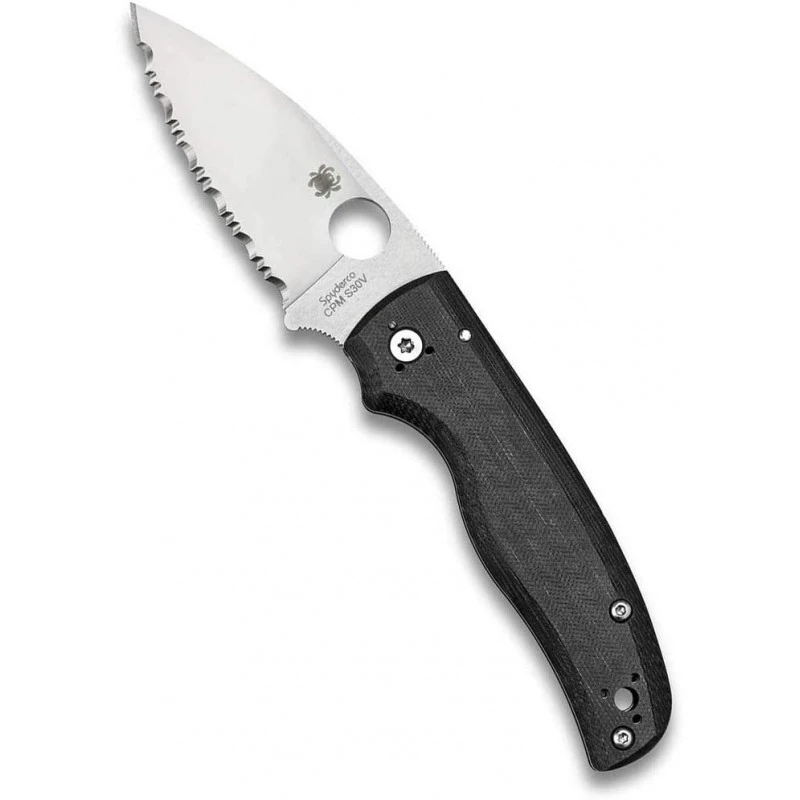 Voici le couteau Spyderco Shaman qui possède une lame dentelée de 9.1cm en acier inoxydable CPM S30V avec une finition stonewash et un manche en G-10 noir (fibre de verre).