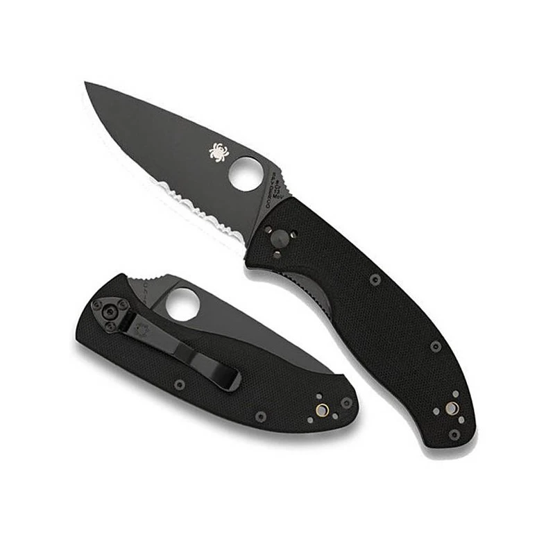 Sa lame pliable en 8Cr13MoV de 8.6cm Noir est semi-dentelée avec un système de verrouillage à Cran d’arrêt.
