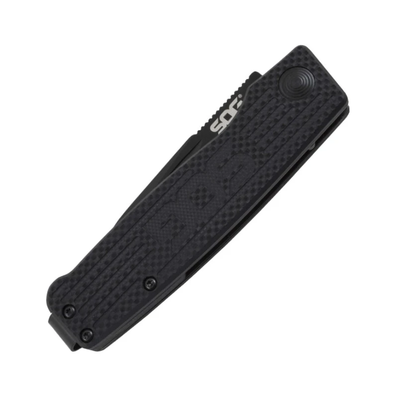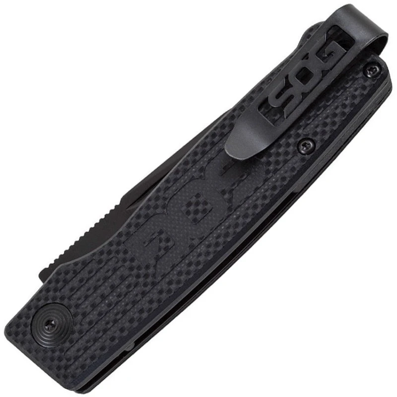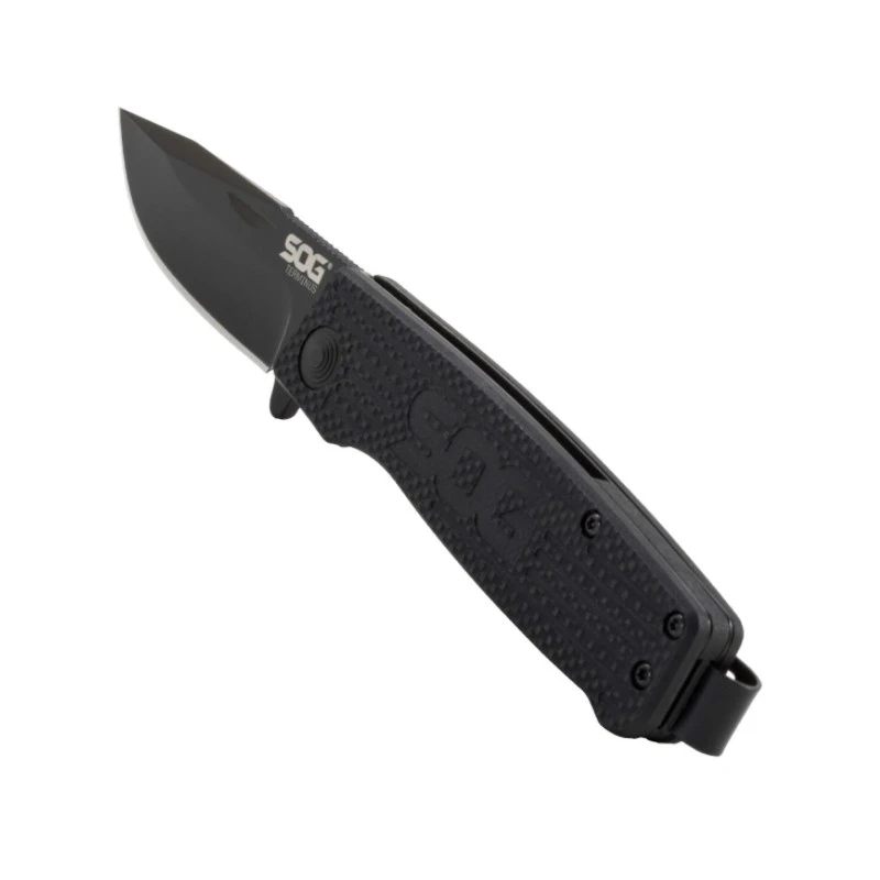 Voici le Couteau Terminus de chez SOG qui possède une lame lisse de 7.6cm en acier inoxydable CTS BD1 avec une finition noir et un manche de couleur noir en G-10 (fibre de verre).