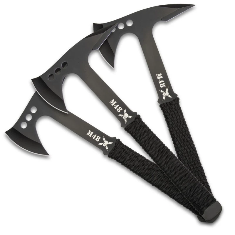 Cet ensemble de haches de lancer M48 UNITED CUTLERY offre une tête avec d’un côté une pointe et de l’autre une tête de hache. Ces trois haches à lancer sont parfaitement équilibrées en poids et sont conçues en acier inoxydable 3Cr13 avec une finition noire et un manche enveloppé de corde noire.