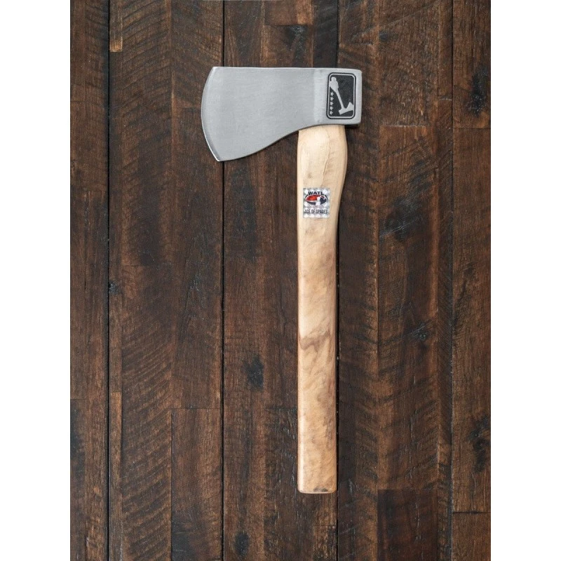 Cette hache est conçue avec une tête en acier carbone 1045 avec une finition brossée et un manche en hickory américain avec une finition de vernis transparent.