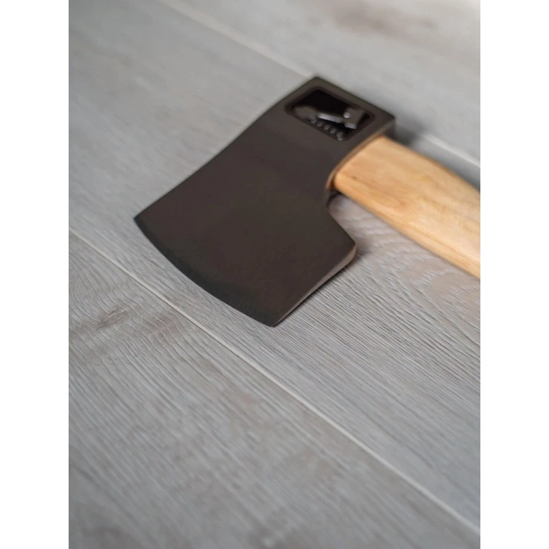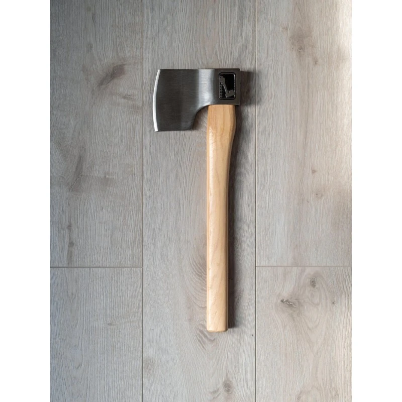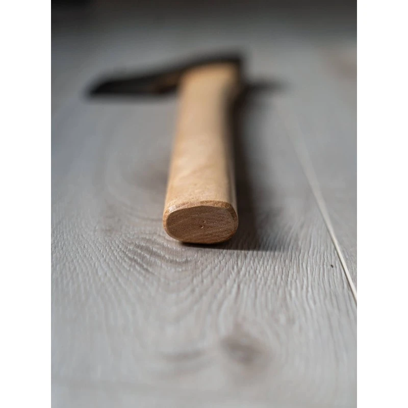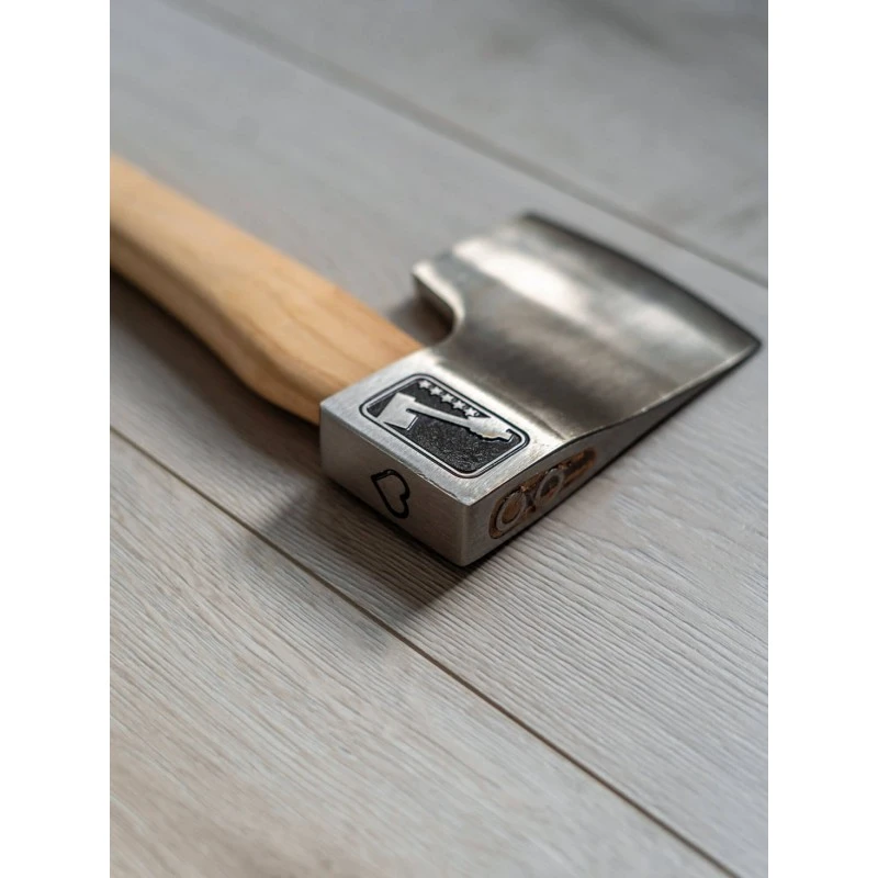 Cette hache est conçue avec une tête en acier carbone 1045 avec une finition brossée et un manche en hickory américain avec une finition de vernis transparent.