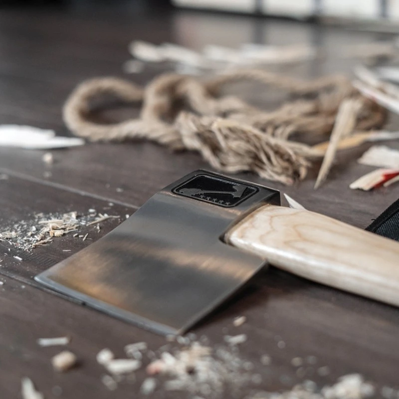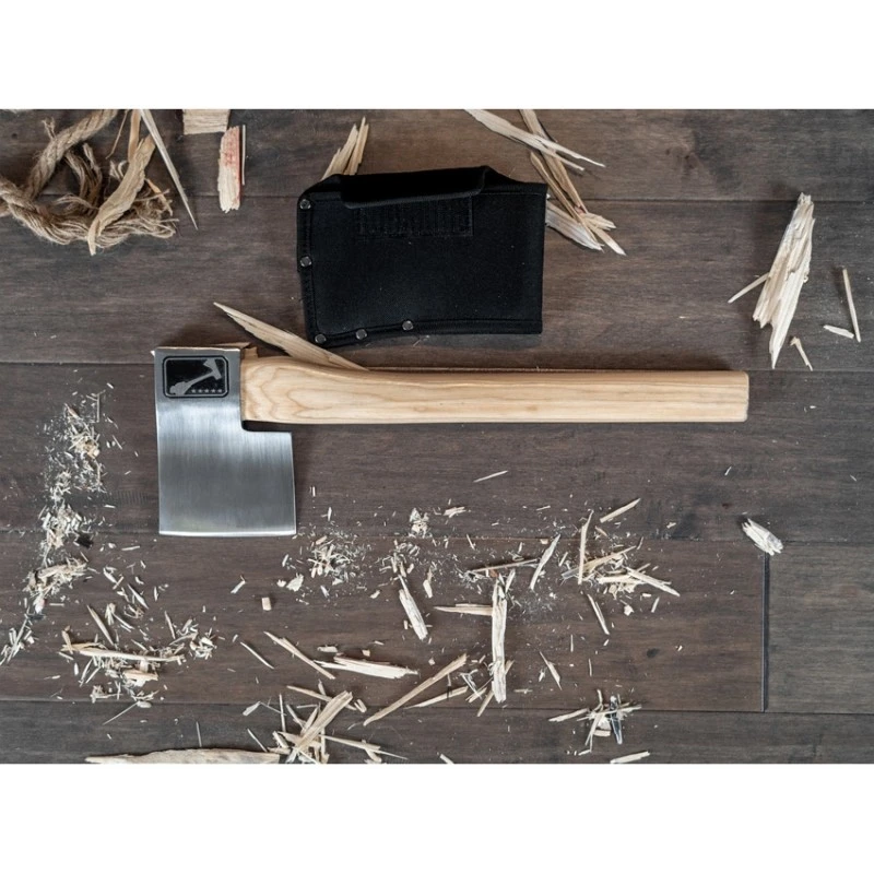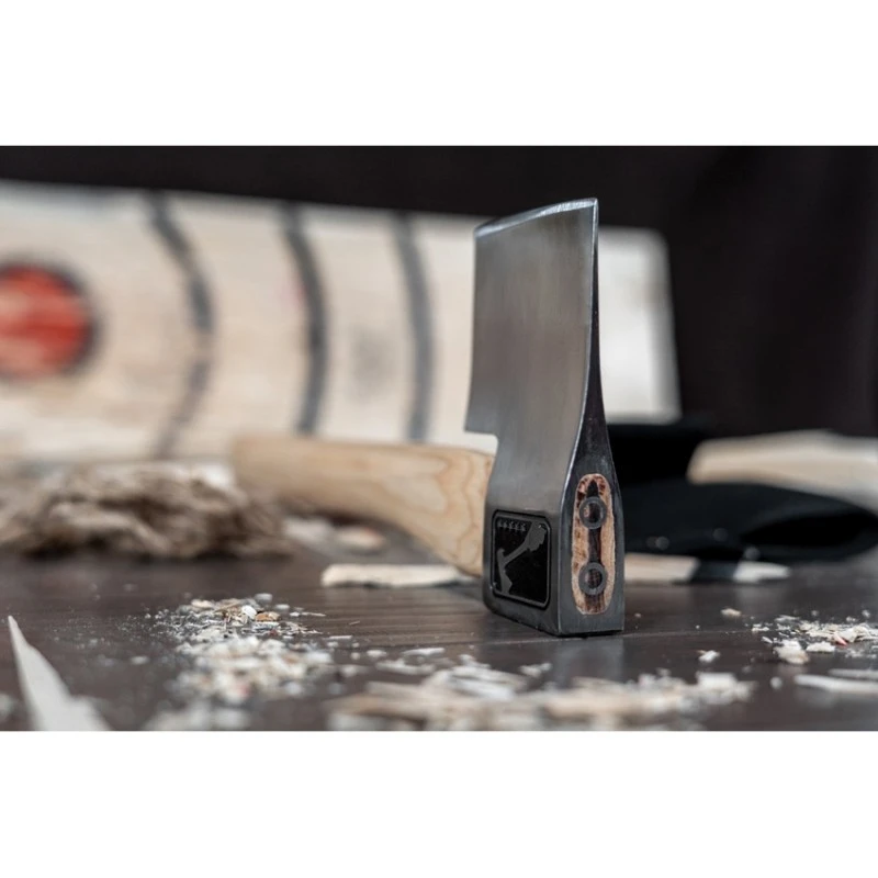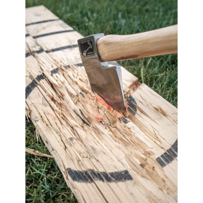 Cette hache est conçue avec une tête en acier carbone 1045 avec une finition brossée et un manche en hickory américain avec une finition de vernis transparent.