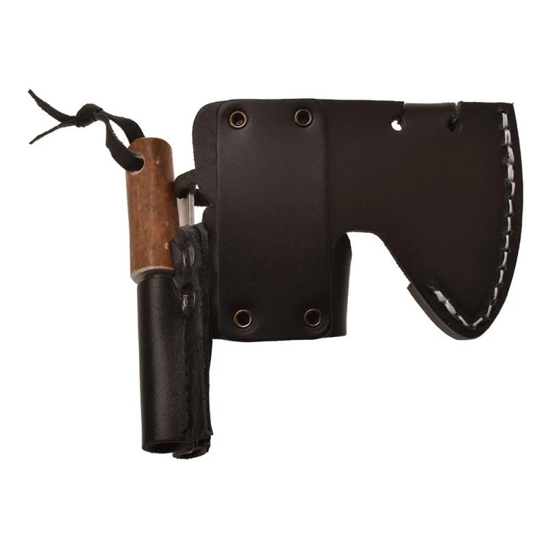 Avec son manche en bois d’hêtre sculpté et son extrémité en corne d’élan, cette hache de seulement 500g comprend un étui en cuir de vachette, un aiguiseur diamanté et un allume feu pouvant être utilisé jusqu’à 1000 fois.