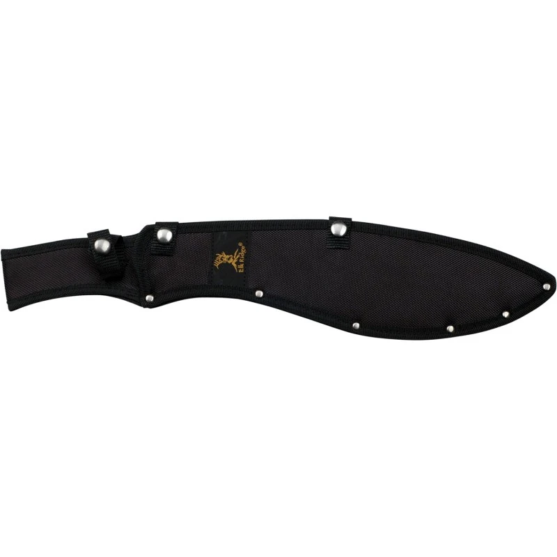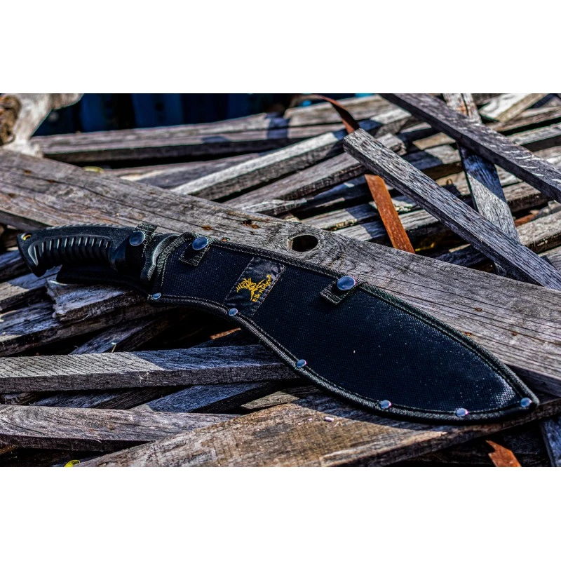 La machette Bolo noire dispose d’un trou pour la lanière et elle est livrée avec son étui en nylon noir qui peut être porté à la ceinture.