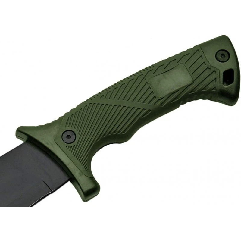 La Machette Hunter Field de RITE EDGE possède une lame en acier inoxydable noir de 20.6cm qui est lisse d’un côté et dentelée de l’autre ainsi qu’un manche en ABS caoutchouté de couleur vert.