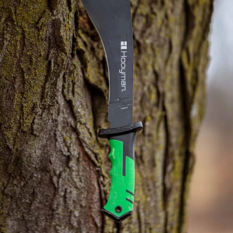 D’une longueur total de 52cm, cette Machette Kukri HOOYMAN offre une lame khukuri de 38cm conçu en acier inoxydable 3Cr13 revêtue d’oxyde noir ainsi qu’un manche synthétique rainuré noir et vert.
