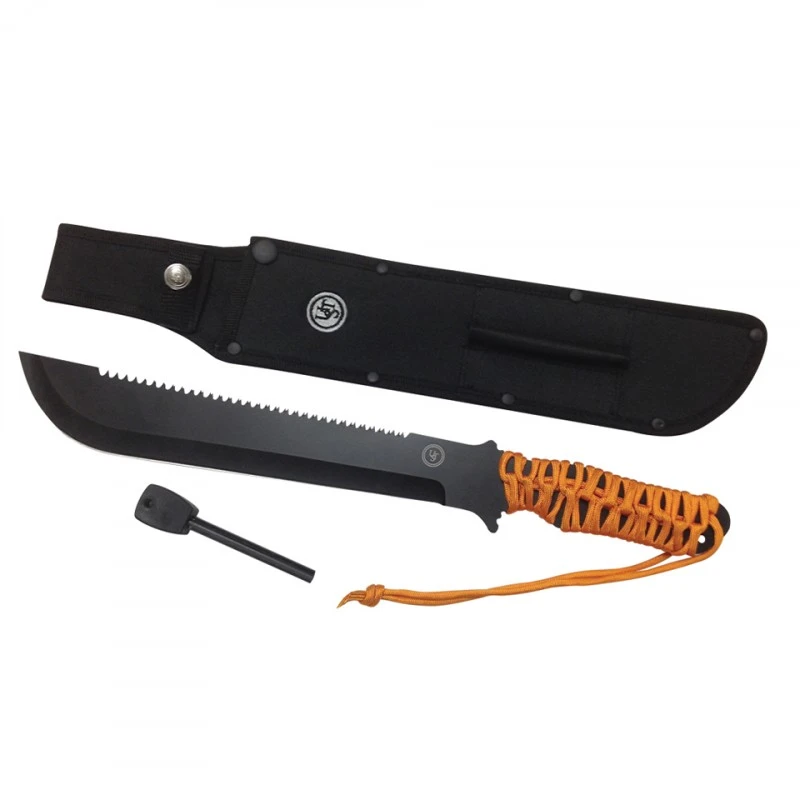 Robuste et flexible, cette machette ParaCuda FS de UST contient une lame revêtu d’oxyde noir comprenant d’un côté une lame lisse et de l’autre une scie. La poignée est enveloppée de paracorde orange pour une prise en main sûre et peut être déroulée (2.7 mètres) en cas de besoin.